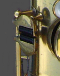 As an example, compare the photos to the right. These are the Eb and low C keys, operated by the right hand pinky. On the old Elkhart, the keys are flat, requiring 100% vertical pressure to operate them. On the Bundy II, the keys are curved, and they are tilted upward, so the pinky uses a more lateral, more natural motion to play them. The left hand pinky keys are similarly tweaked, as are the palm keys and many others.