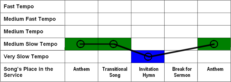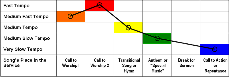 If you try to draw these curves for a typical contemporary worship service, you’ll discover than the curves tend to go in somewhat opposite directions. Here’s an example, using a common pattern: An upbeat Call to Worship followed by another one that is even faster. These are followed by a Transition song with a bit less physical energy but more spiritual content. Next, an Anthem gives the congregation the opportunity for high spiritual praise. Finally, a Devotional closer helps focus the congregation’s attention on the “life application” from the sermon.